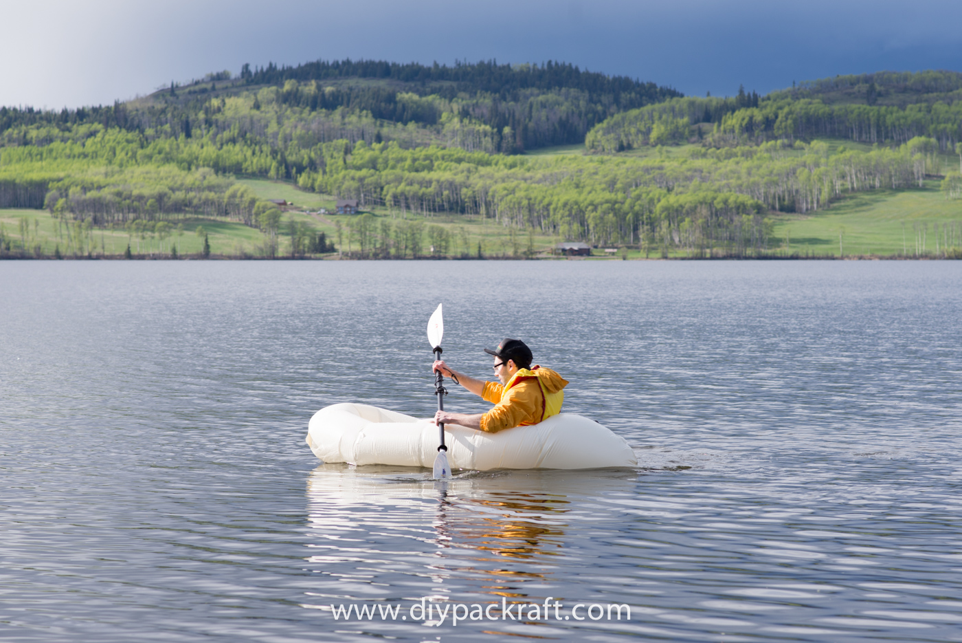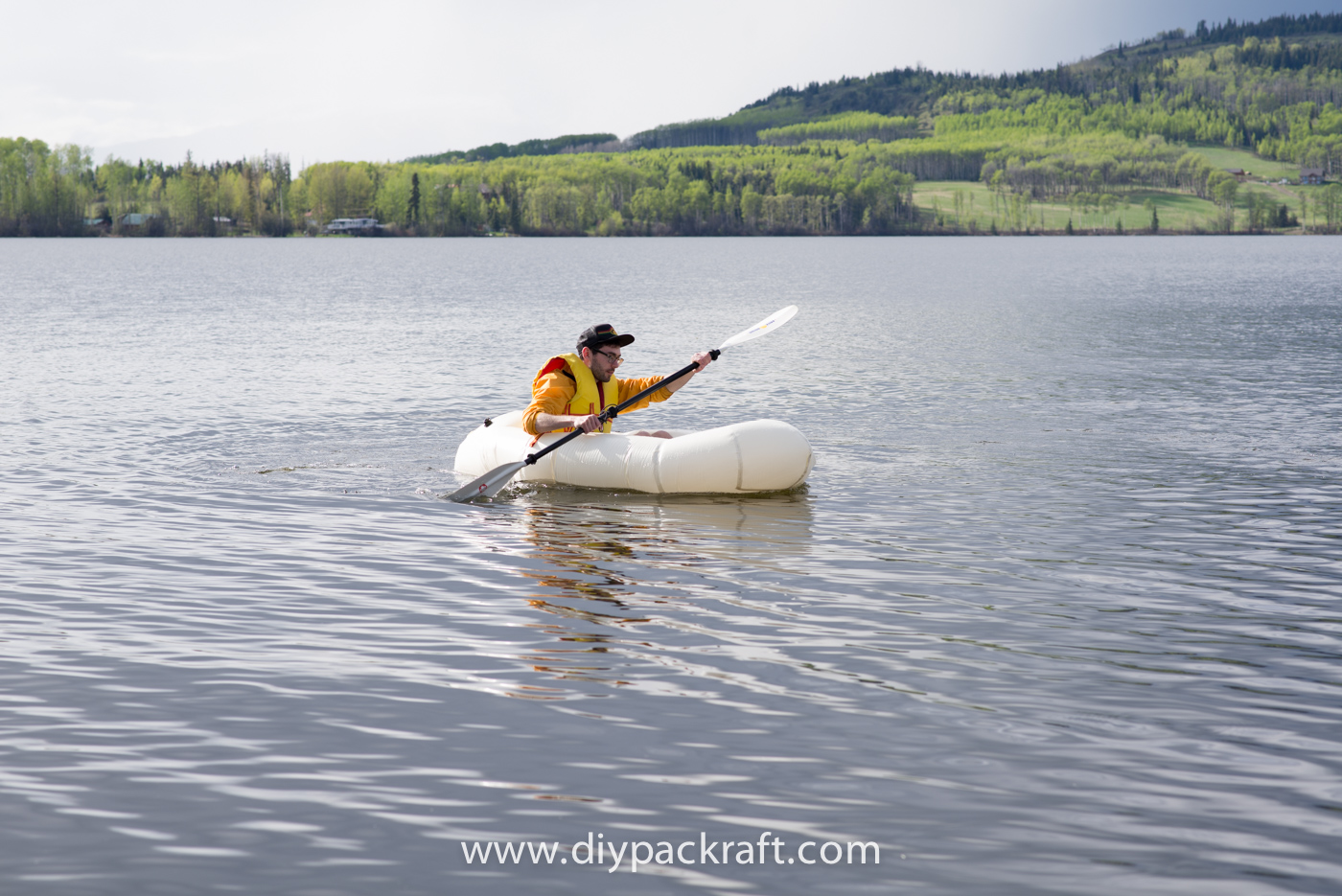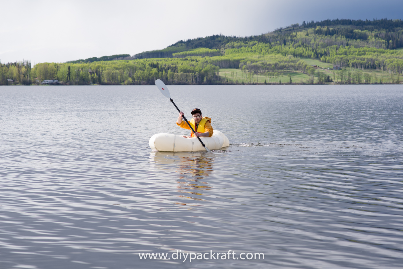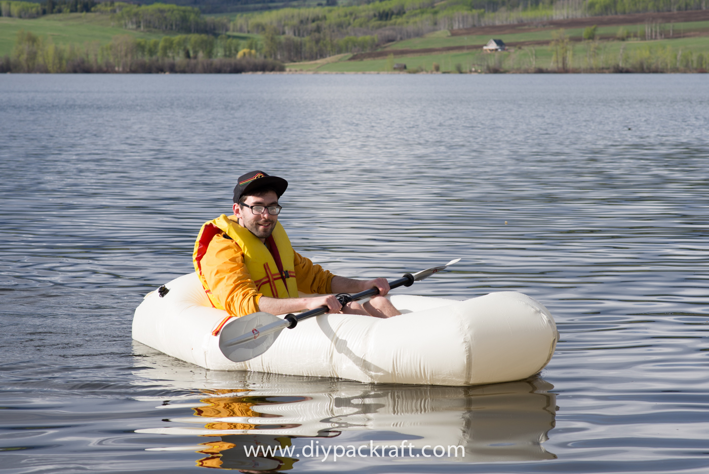 This weekend I went paddling with some friends on a local lake – they in kayaks and canoes, and me in my newly finished DIY packraft prototype #3. I’m happy to report that it performed well and, just as importantly, I finally managed to take some pictures! Here are some shots of my friend Dylan taking the packraft for a spin: