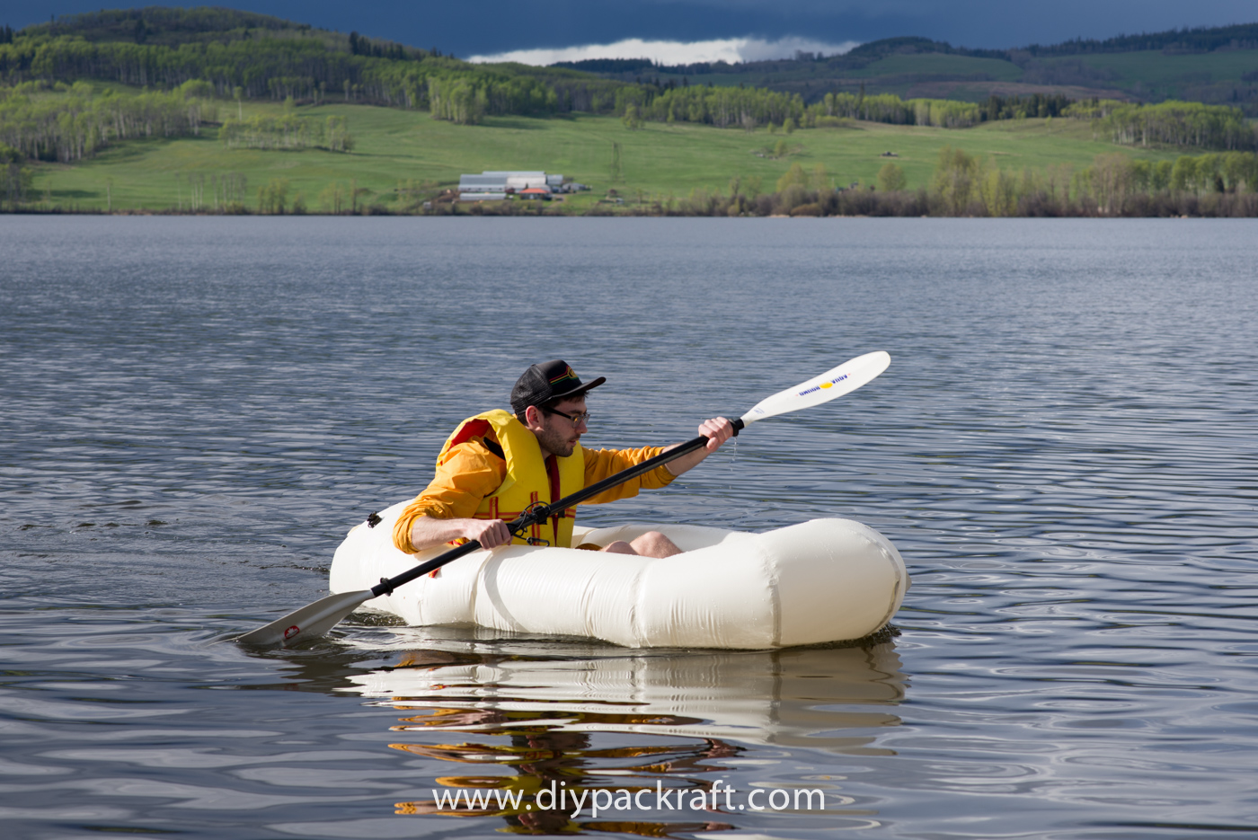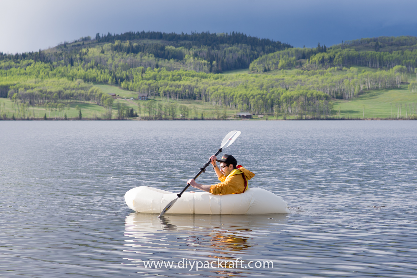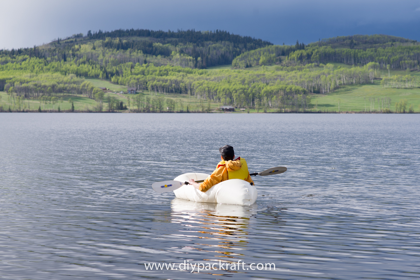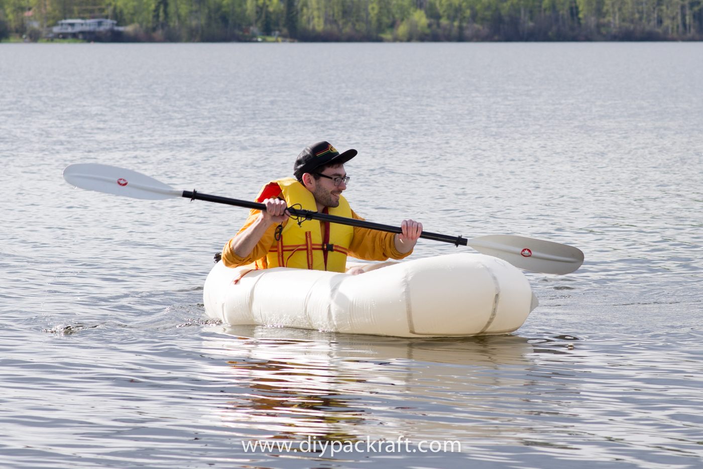 This weekend I went paddling with some friends on a local lake – they in kayaks and canoes, and me in my newly finished DIY packraft prototype #3. I’m happy to report that it performed well and, just as importantly, I finally managed to take some pictures! Here are some shots of my friend Dylan taking the packraft for a spin: