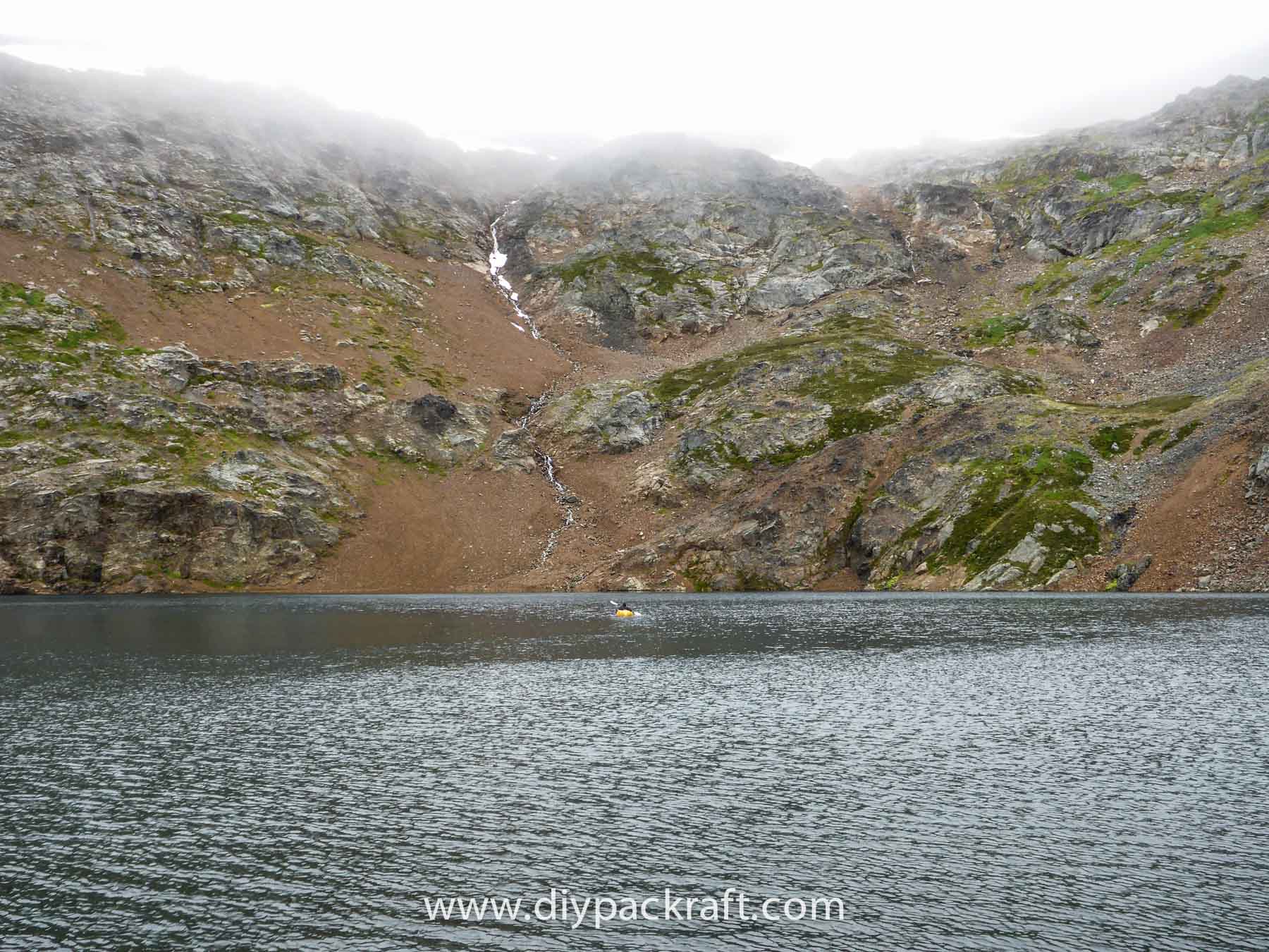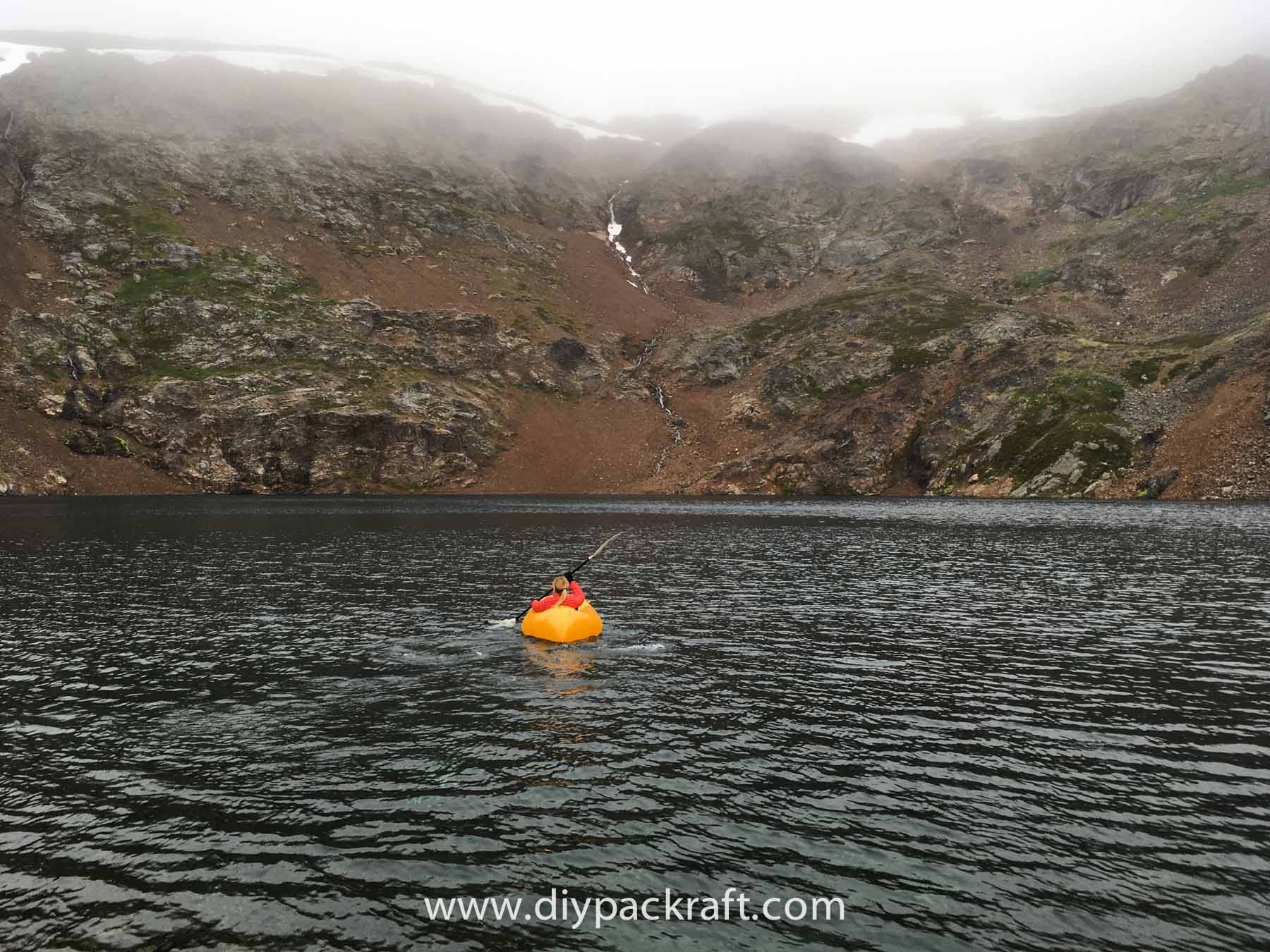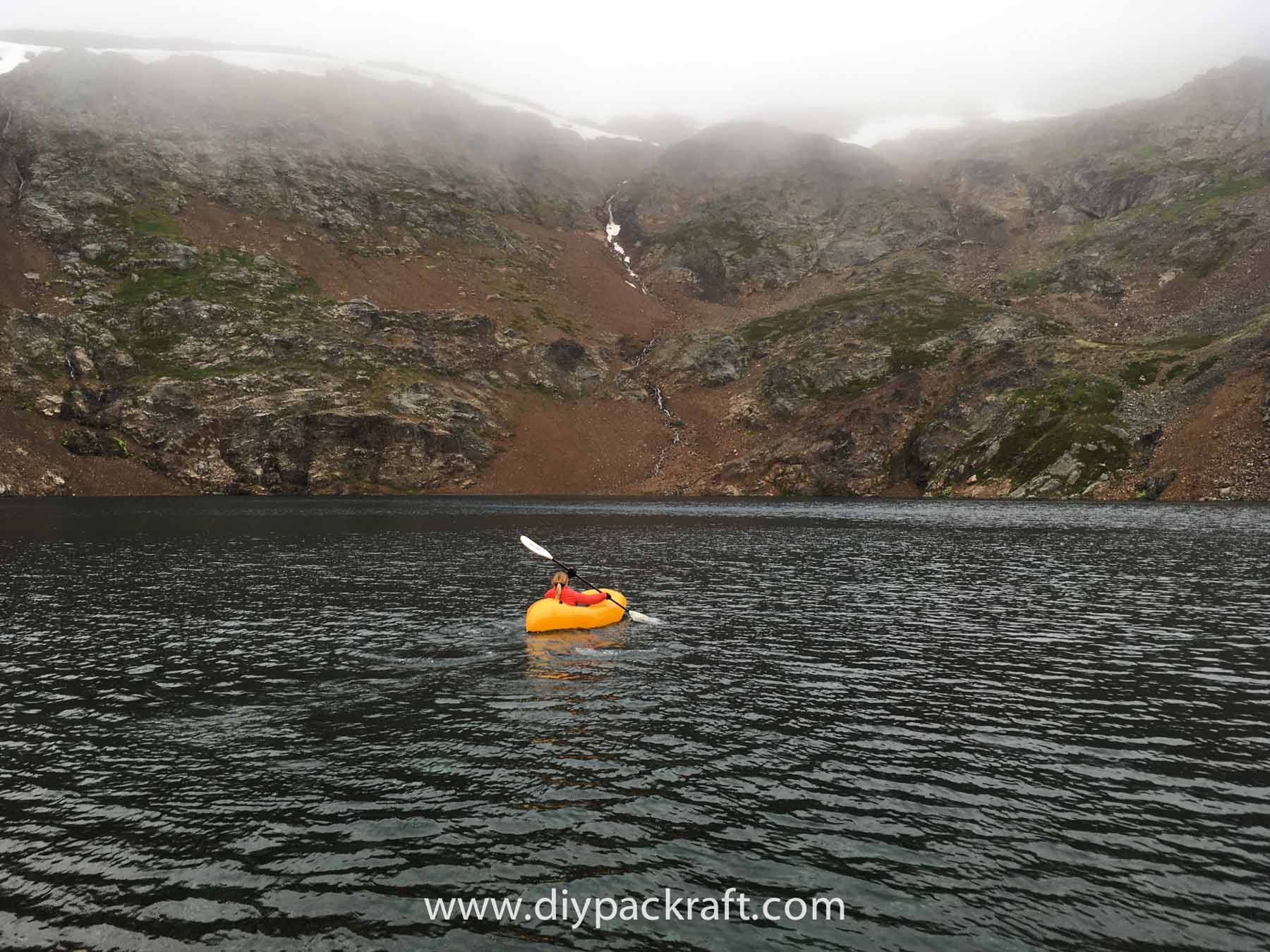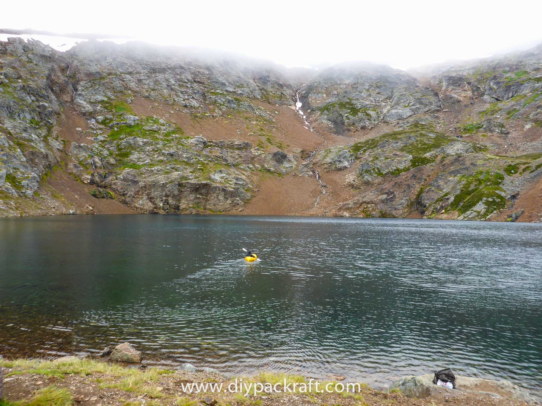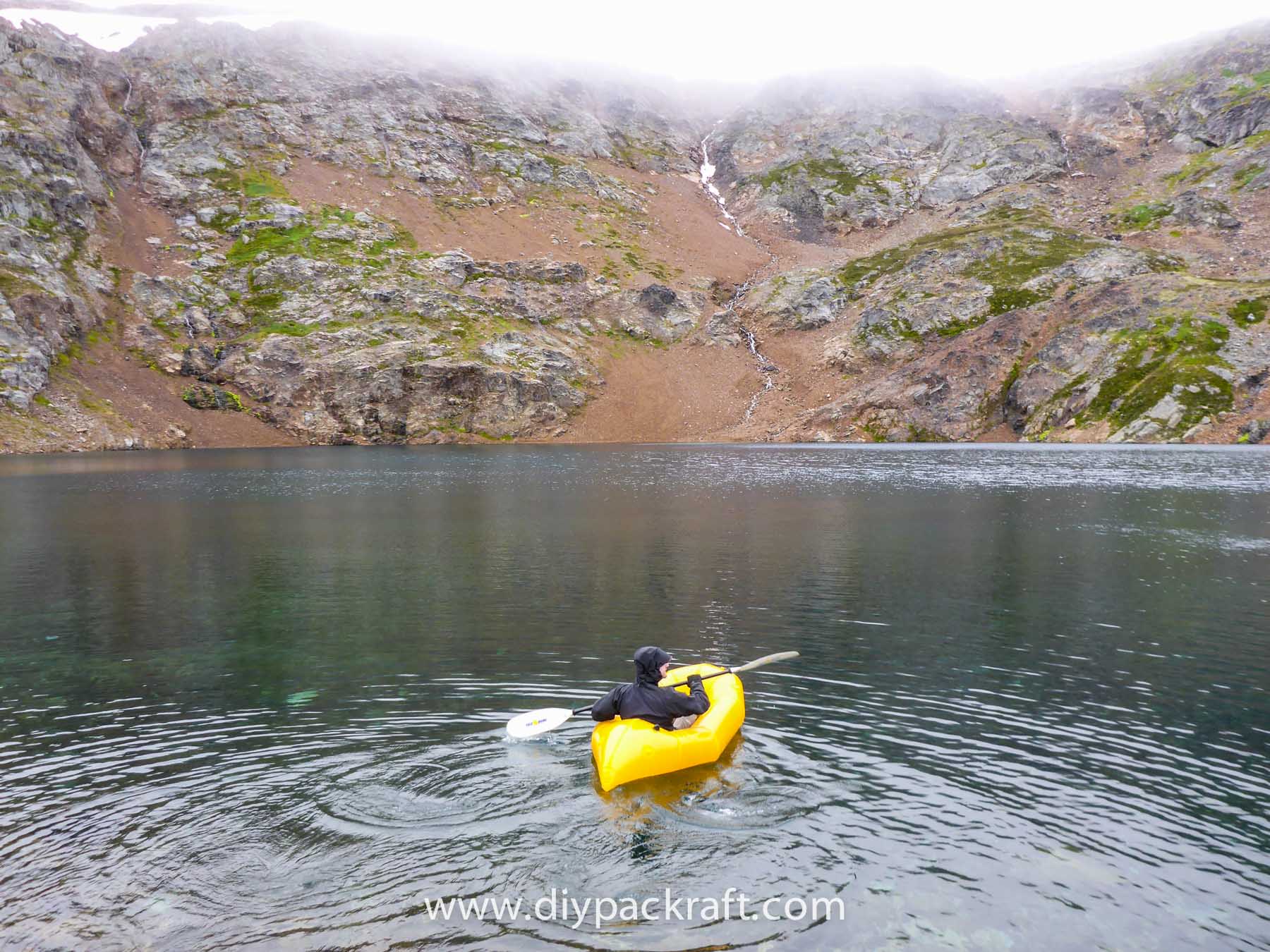 Yesterday three of us went for a hike in the alpine above the valley where I live, and I brought a packraft in case we felt like going for a paddle. I’m glad I did, because in spite of the cold and rain, it was great fun. We were probably the first people to ever paddle a boat in this lake, which is at about 1800 metres (5900′), high above the nearest road.
