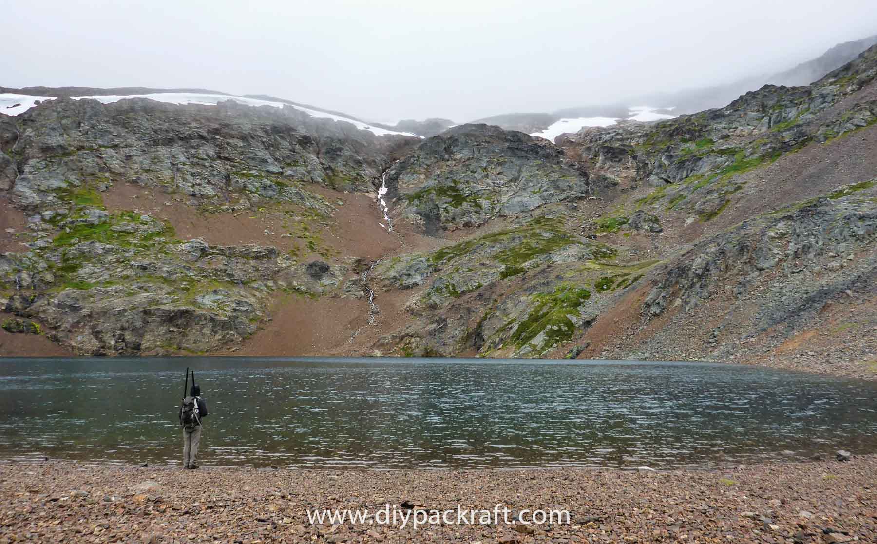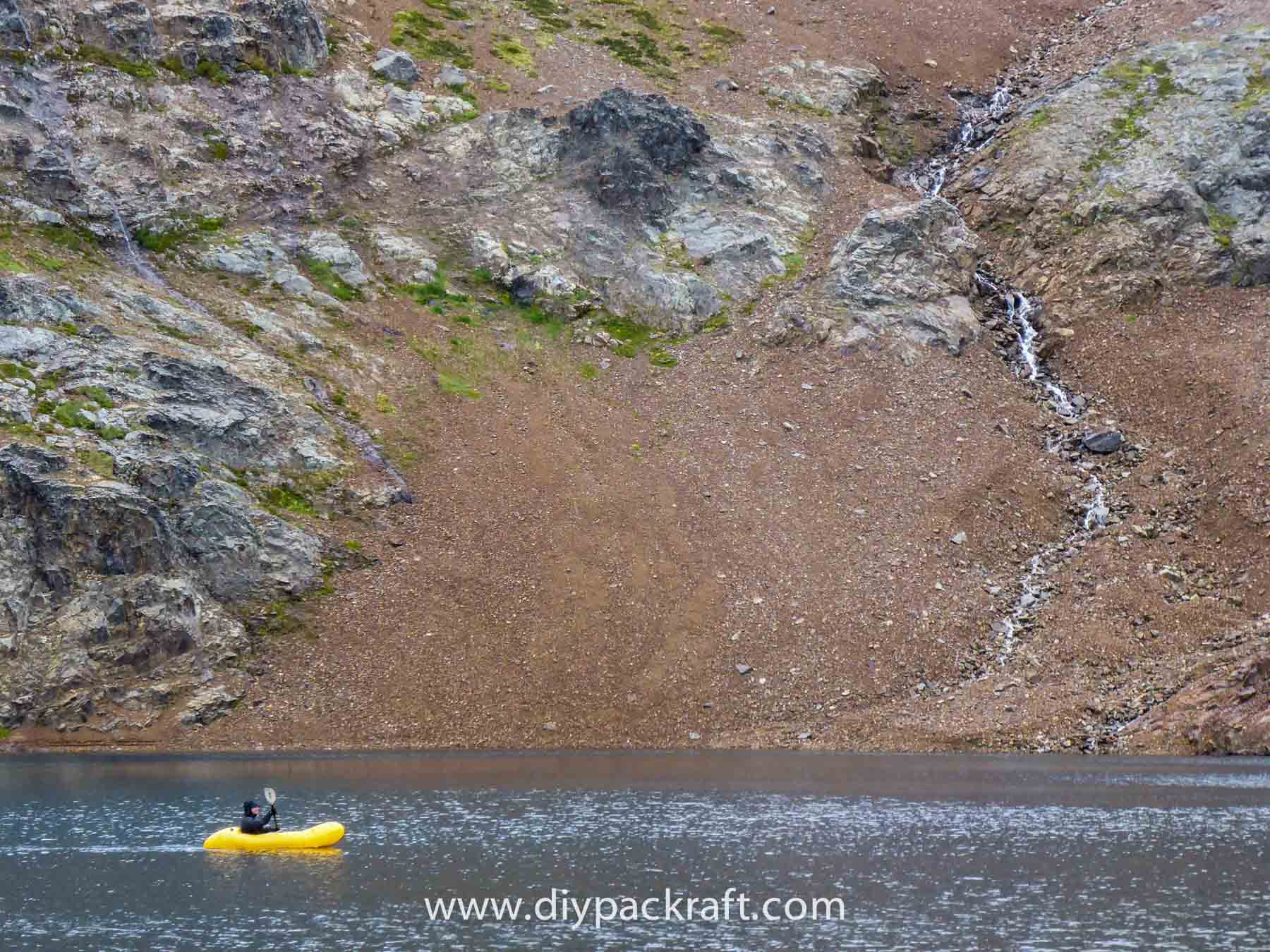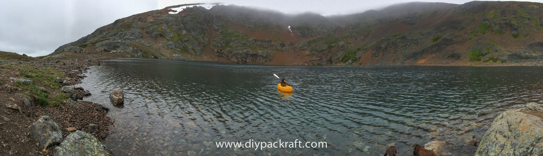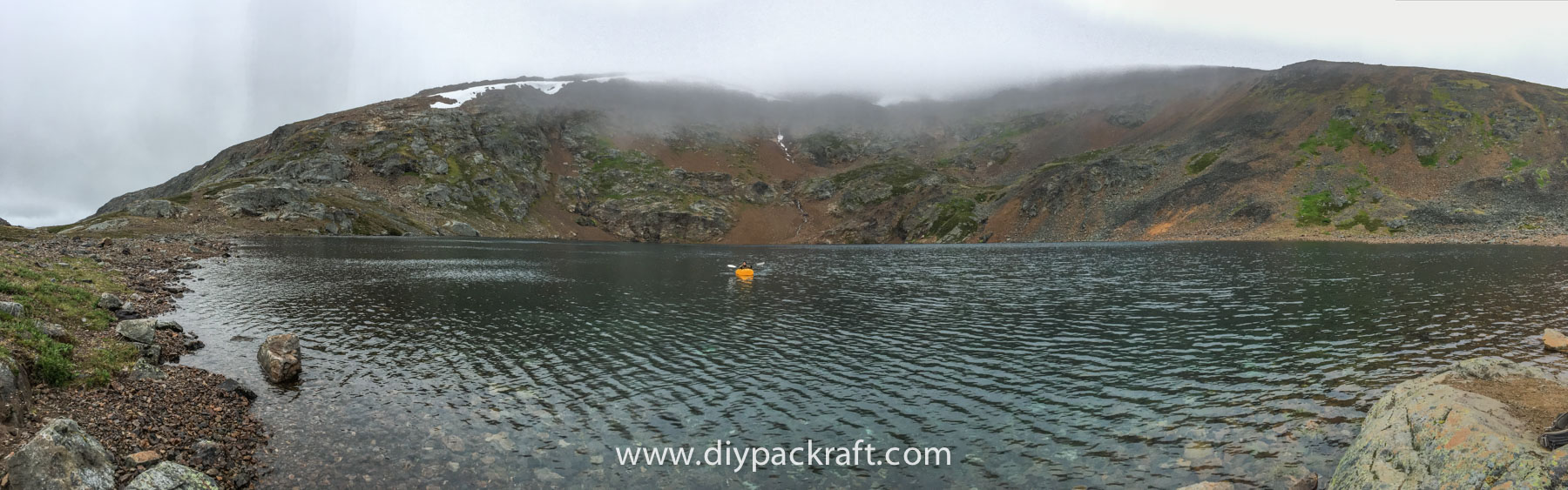 Yesterday three of us went for a hike in the alpine above the valley where I live, and I brought a packraft in case we felt like going for a paddle. I’m glad I did, because in spite of the cold and rain, it was great fun. We were probably the first people to ever paddle a boat in this lake, which is at about 1800 metres (5900′), high above the nearest road.