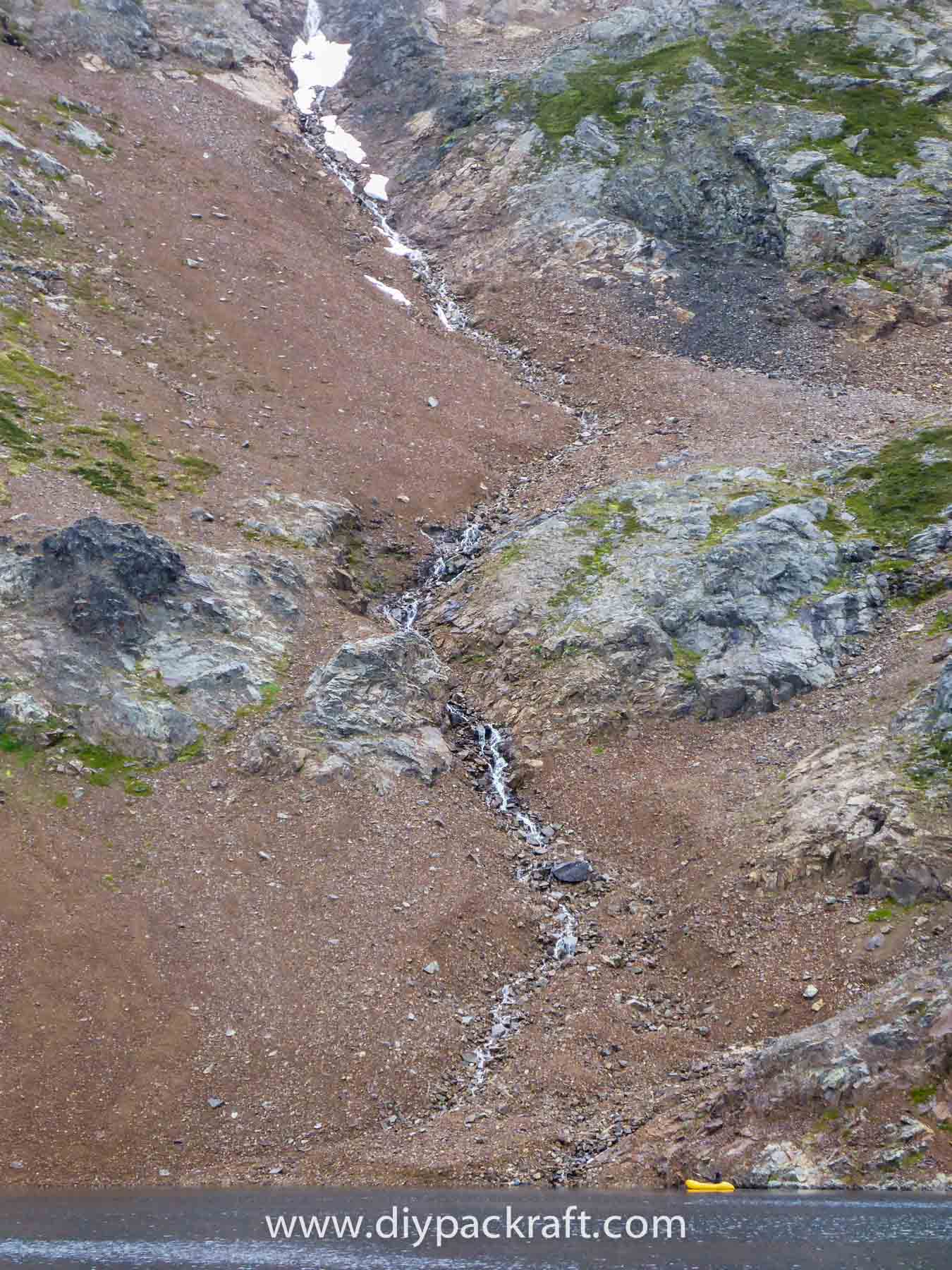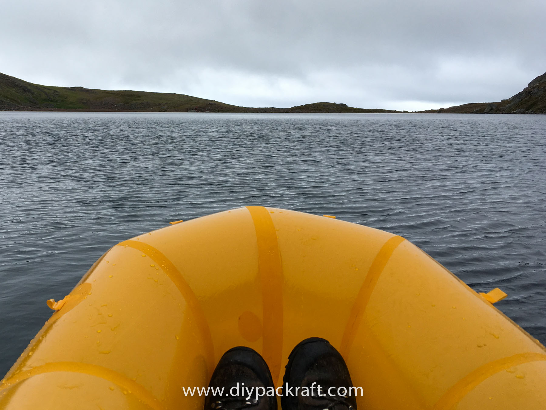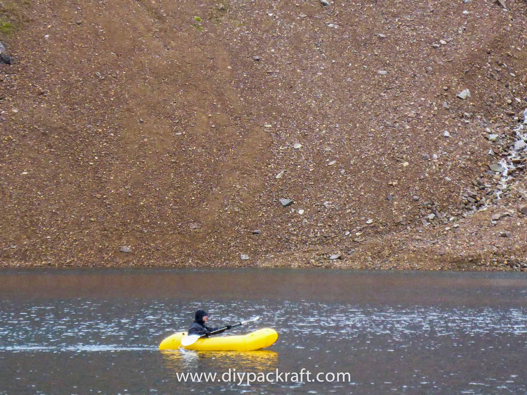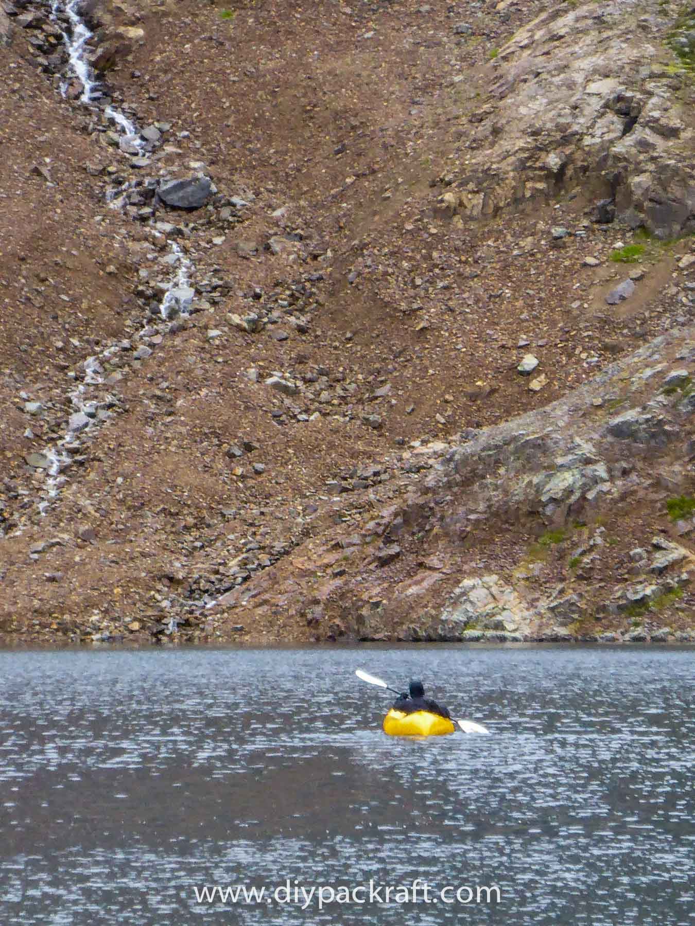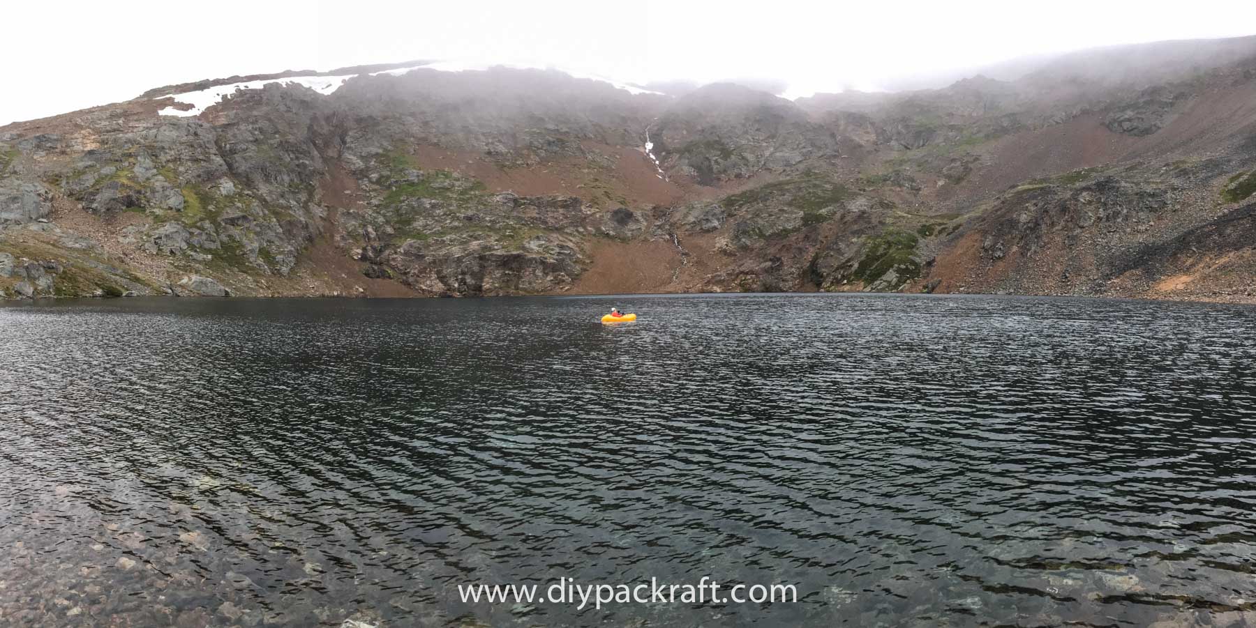 Yesterday three of us went for a hike in the alpine above the valley where I live, and I brought a packraft in case we felt like going for a paddle. I’m glad I did, because in spite of the cold and rain, it was great fun. We were probably the first people to ever paddle a boat in this lake, which is at about 1800 metres (5900′), high above the nearest road.