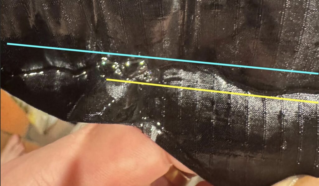 Leaks around the perimeter can be caused by several different factors. In the image above, you can see that the interior edge of the weld isn’t totally straight – ideally the weld would be parallel to the grid lines in the fabric, like the yellow line drawn above. (Note that even when the edge of the weld is straight, the act of inflating the backrest will cause the edges to buckle and curve – that is not the waviness I am referring to here – I’m talking about the way the weld itself isn’t straight.) A wavy weld line is a sign of an incomplete weld, and could be caused by: