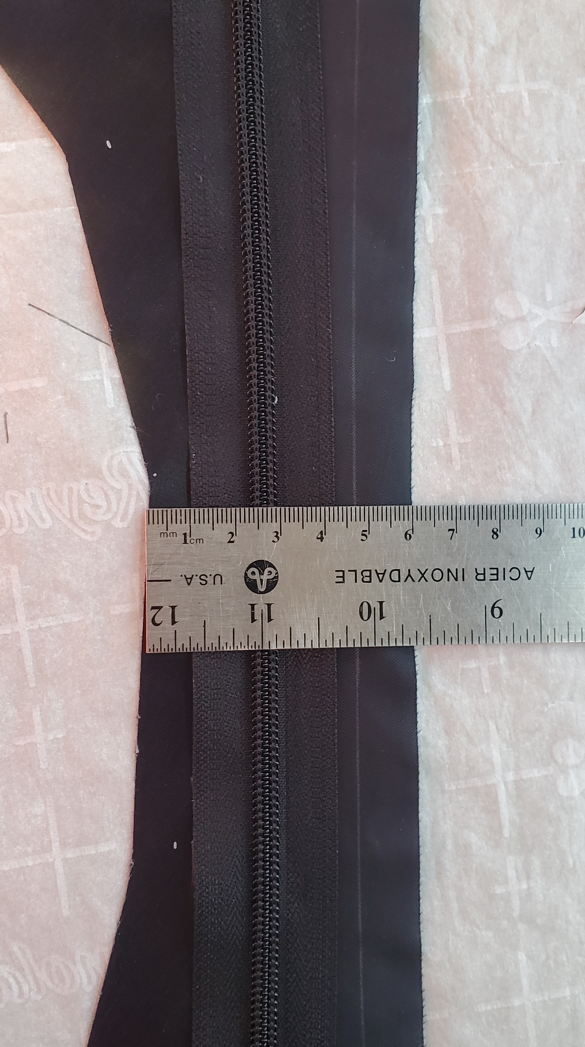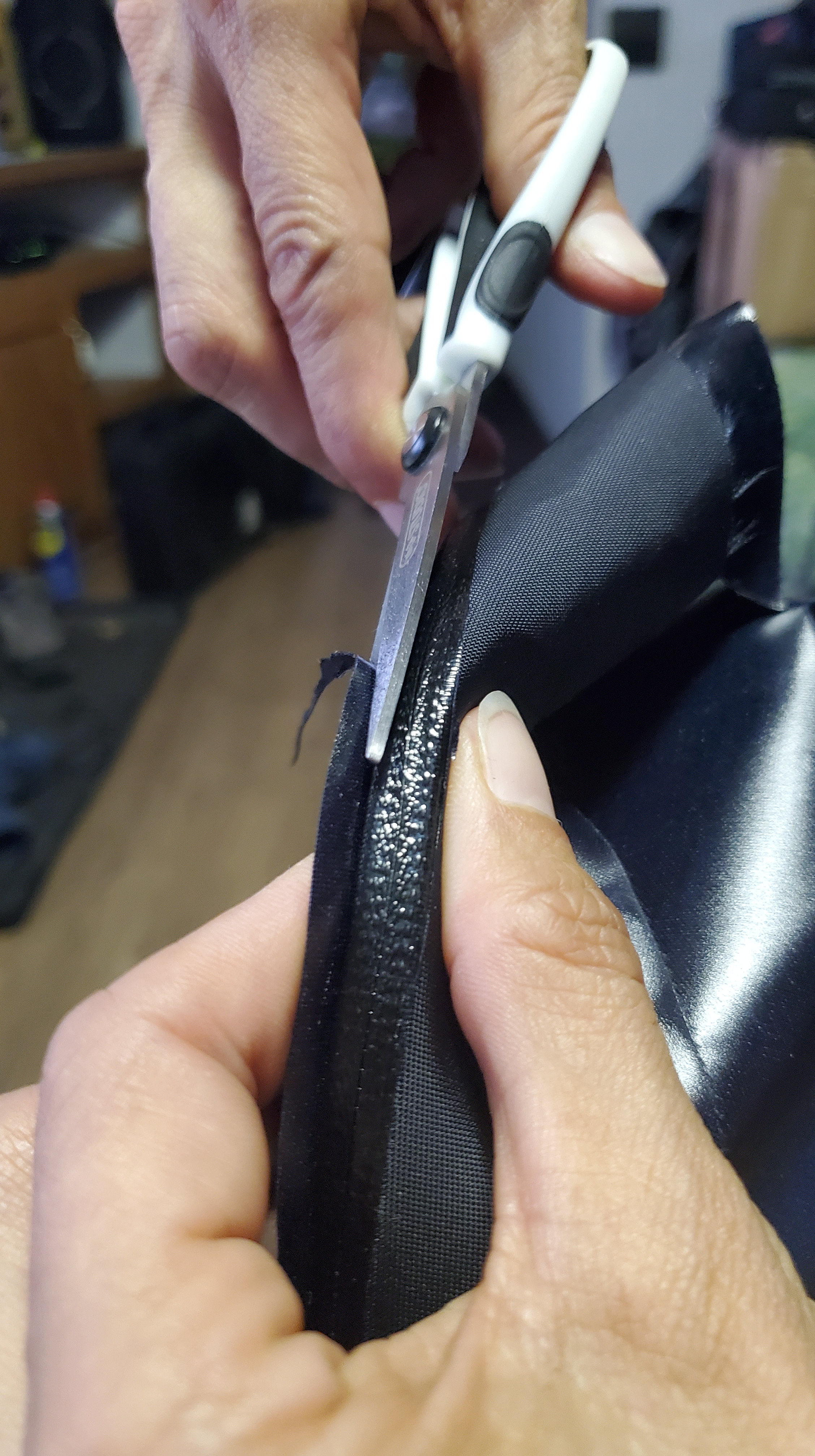 On that first stretch (and the last one), the spray deck fabric gets too narrow to fit the 1” strip, the zipper (1.25” wide for #5), and leave room to weld the tube later on. In this area only, I have made the zipper overlap slightly the 1” strip in order to leave 1 cm of TPU deck fabric exposed for the tube. The part of the zipper that overlap the 1” strip and the part of the tube that will overlap the zipper will be glued on later.