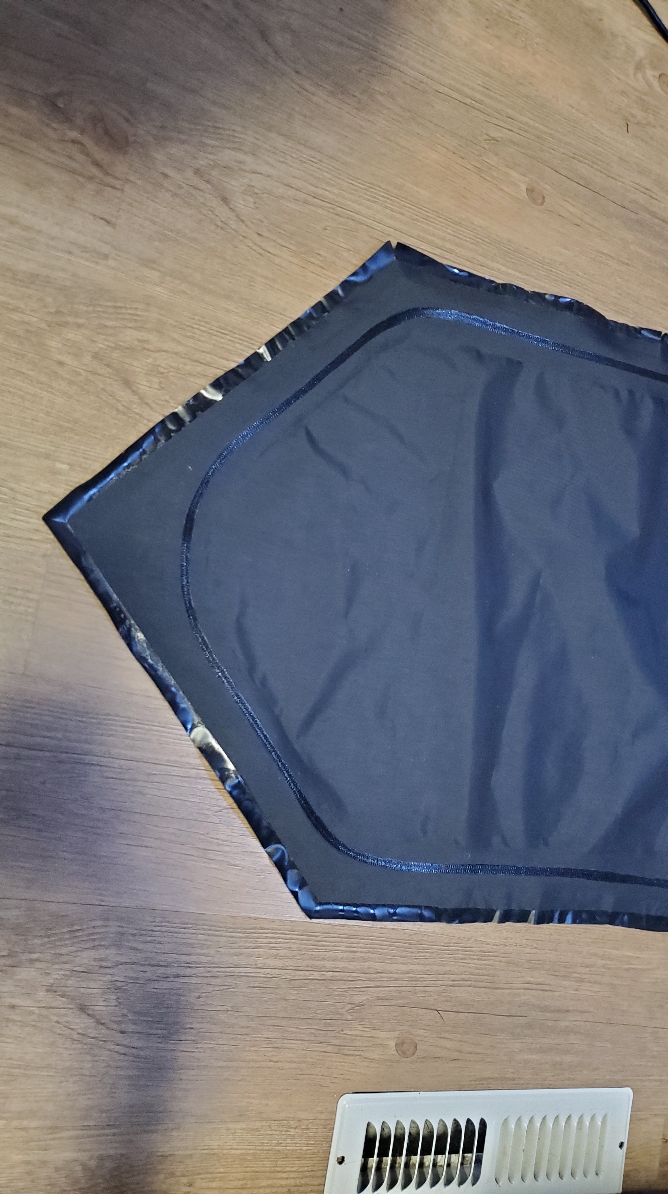 You will have to determine where the joint on the 1″ strips will be along the sides of the spray deck. Tape the deck onto the inflated raft to mark where the joints (ends) of the 1″ strips will be. Each corner of the spray deck must land on the 1″ strips of the raft. In the same manner, the joint along the straight side of the spray deck will land on the 1″ strip of the raft. Mark the deck fabric in these 2 locations