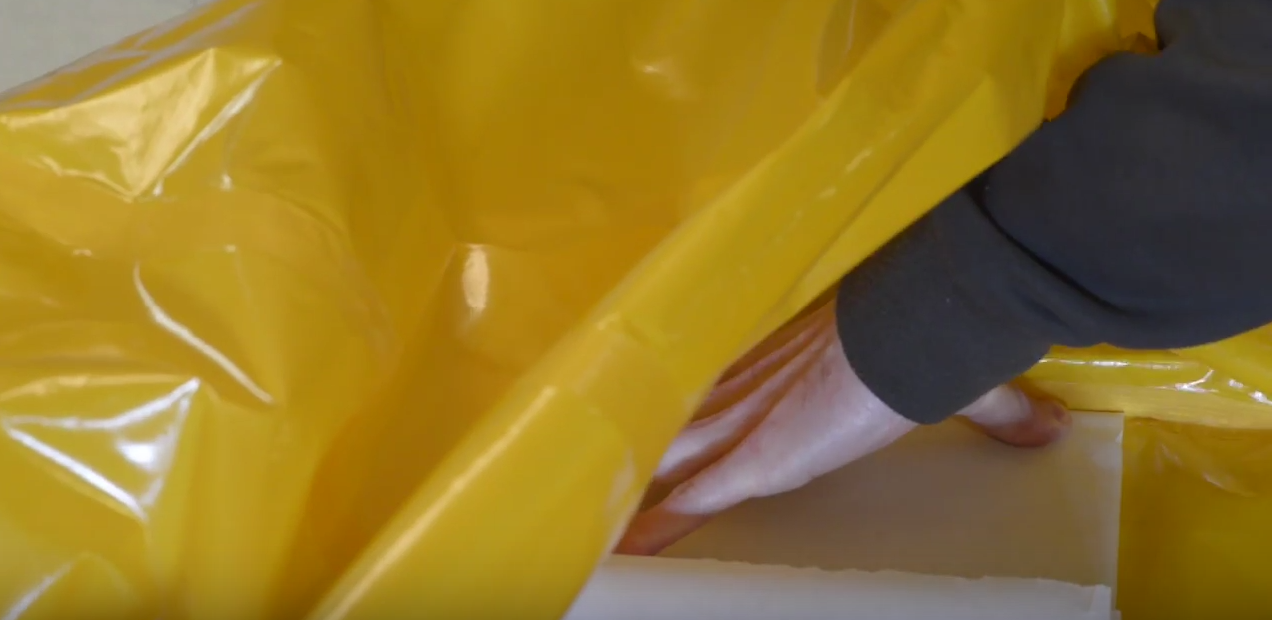 When you’ve bonded one straight length of tubing fabric to the floor and the curved seam at either end, fold the tubing fabric back to expose the inside of the joint (the TPU side of the fabric).