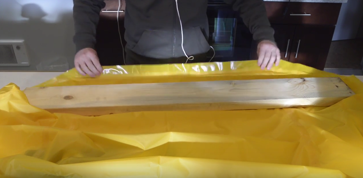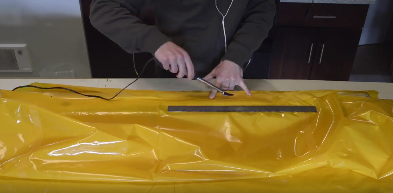 Fold the 3 cm band of floor fabric over the tubing fabric with the heat sealable sides facing each other and begin bonding them together, working your way along the seam from one end to the other. If you’re using very thin fabric, as I am in the demo, don’t try to seal right up to the edge of the fabric or you might touch the TPU coating with your iron. Instead, after most of the overlap is sealed, slide the wood out of the tubing, flip the fabric over so the seam is facing down onto a piece of parchment paper, and then seal the edge by placing your iron inside the tube. I couldn’t get a good camera angle of this for the video, but by the time you reach this step I think you’ll understand what I mean. If not, send me a message or leave a comment below.
