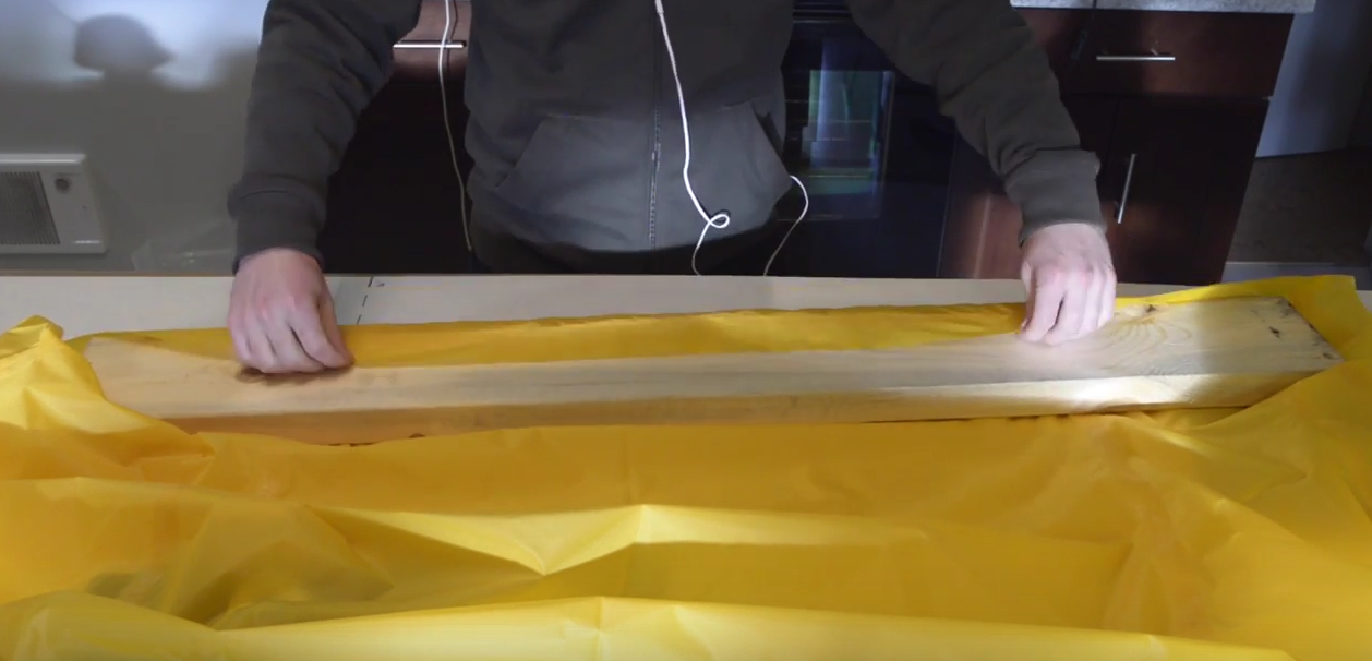 Wrap your tubing fabric around a piece of dimension lumber or other flat, heat resistant object so that the straight edges of the fabric line up on top of the wood. You may find it helpful to place some weights on the fabric to keep it in place.