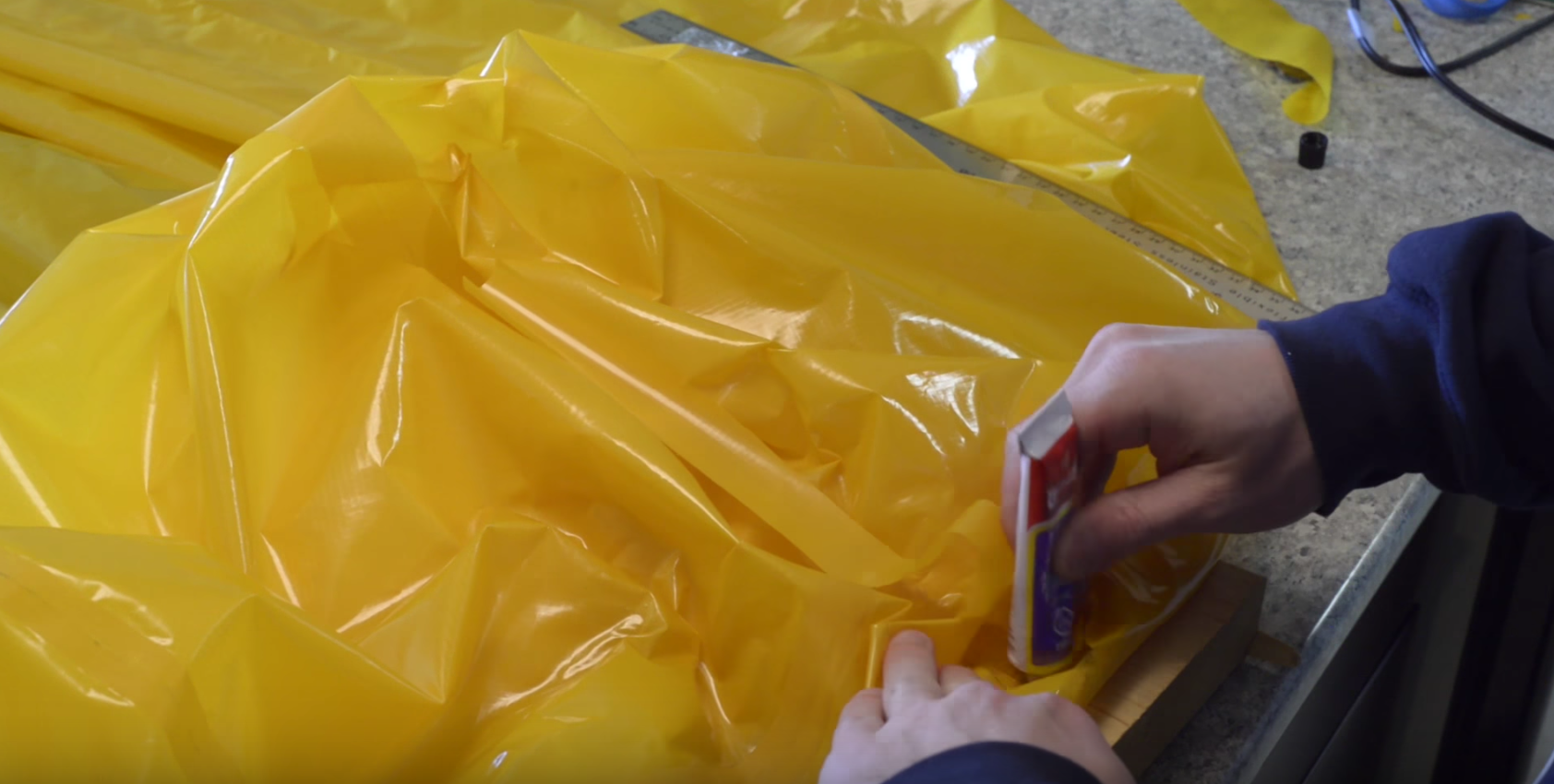 Start by laying out your fabric right way up with the front end of your packraft pointing towards you. Cut a strip of fabric at least 2 cm wide, and longer than the seam you will be bonding. Note that as with any curved seam, the wider you make this strip, the stronger the seam will be, but the harder it will be to seal it without creating wrinkles (because you will be bending a flat piece of fabric around a compound curve).