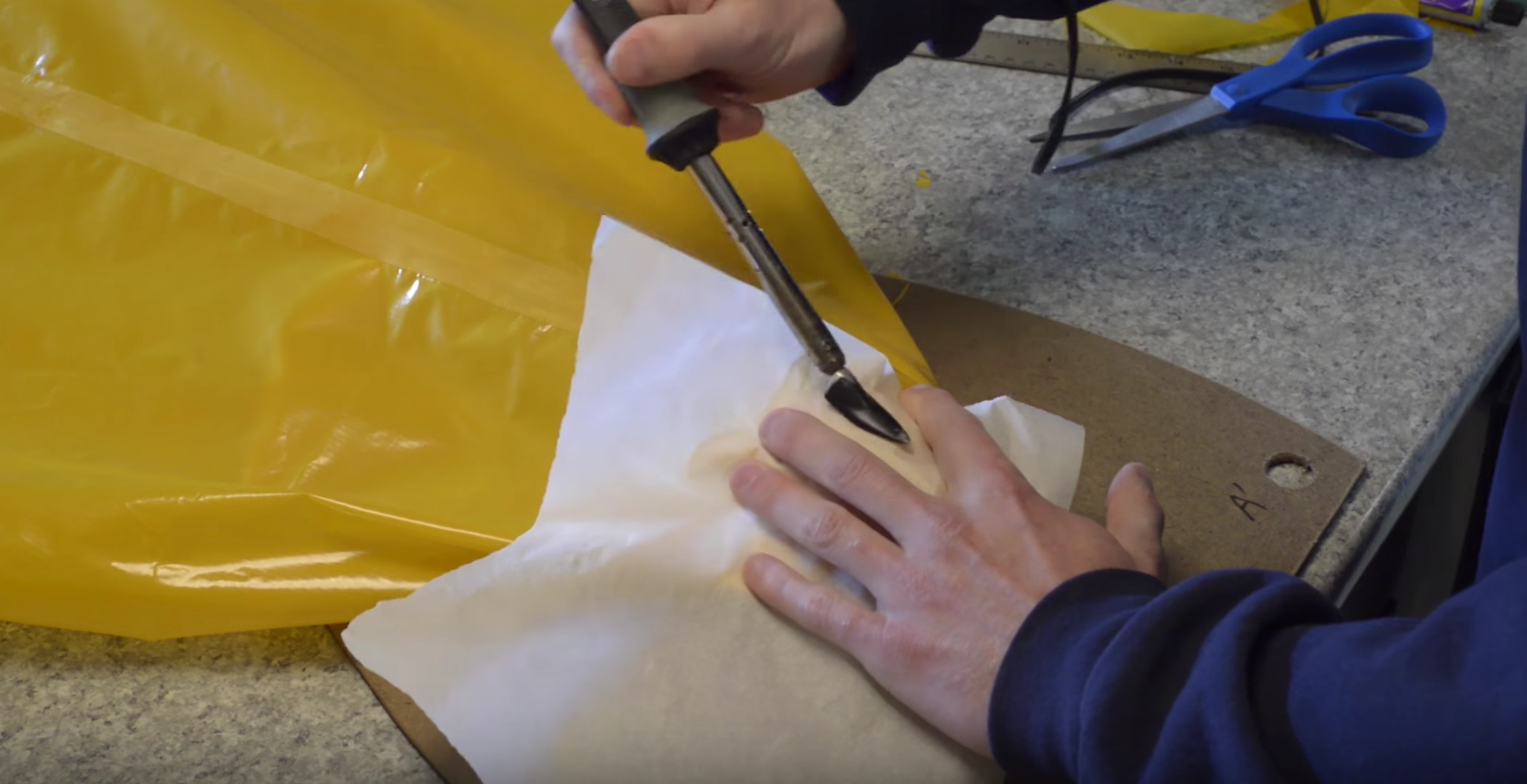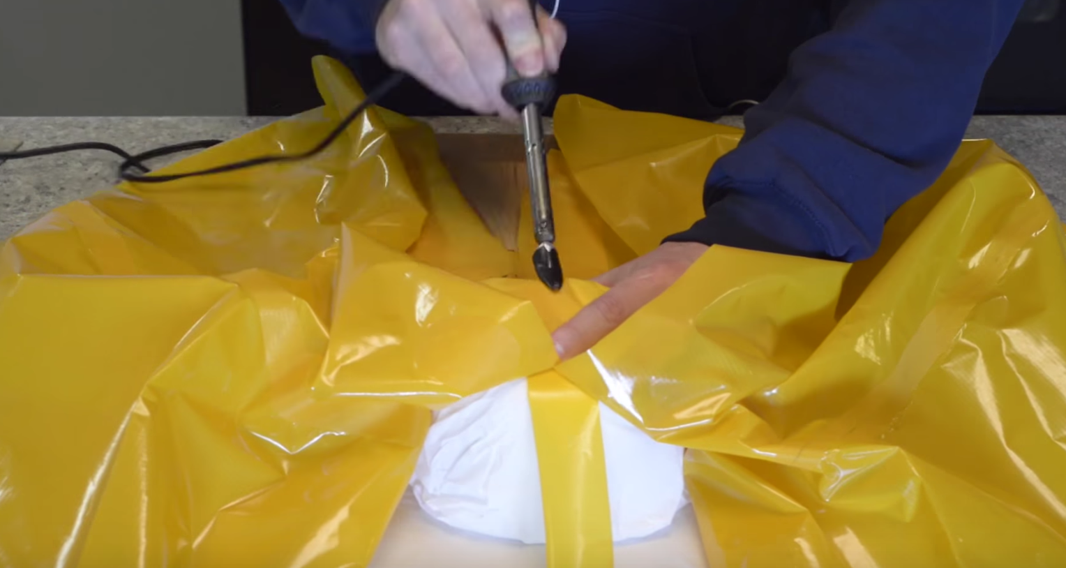Eventually, as you get closer to the end of the seam, you will no longer be able to access it from the inside, so instead, place your bowl inside the tube and finish the seam by sealing it from the narrow strip side. You can place a piece of parchment paper between the fabric and your iron if you are worried about touching the TPU beside the strip.