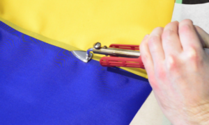 These narrow strips of fabric should be 2-2.5 cm wide – any wider than that and you may have trouble avoiding wrinkles in your seams. For the demo packraft, I cut strips 22.5 mm wide. This width provides enough overlap for a very strong seam, without being so wide that wrinkles will form as the fabric is curved in multiple directions.