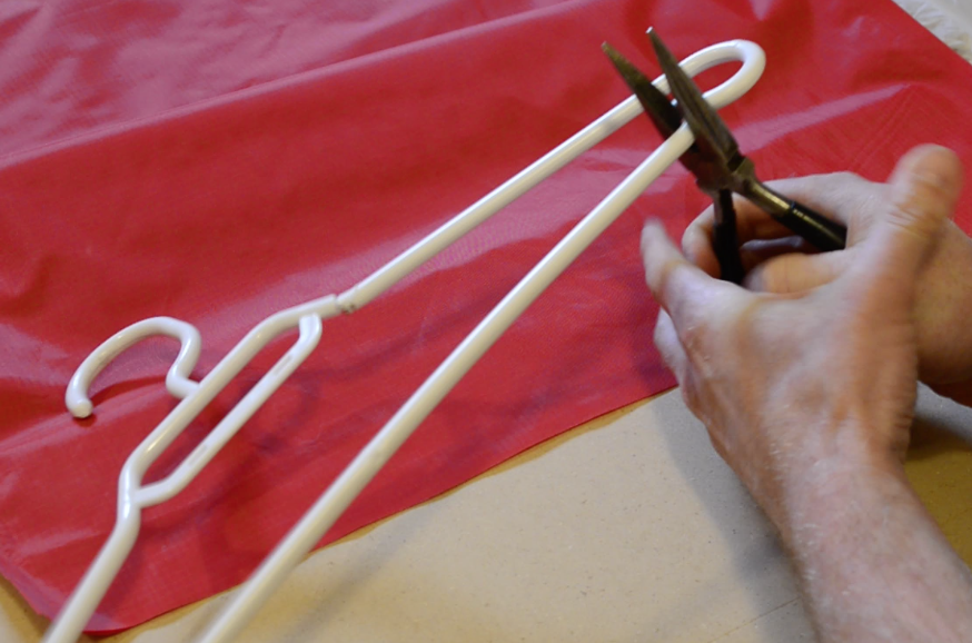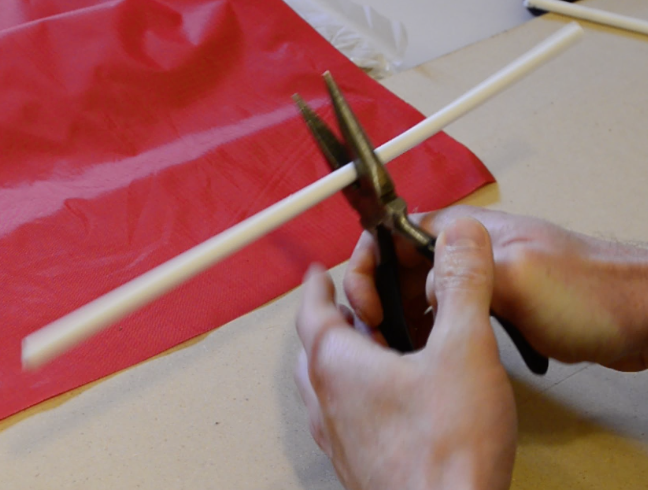 Optional (shown briefly in the video above): Cut two ~15-20 cm (6-8″) lengths of plastic rod from a plastic coat hanger or other cheap plastic object. These will make convenient handles for your inflation bag, but are not necessary if you want to save a few grams and make your inflation bag more packable.